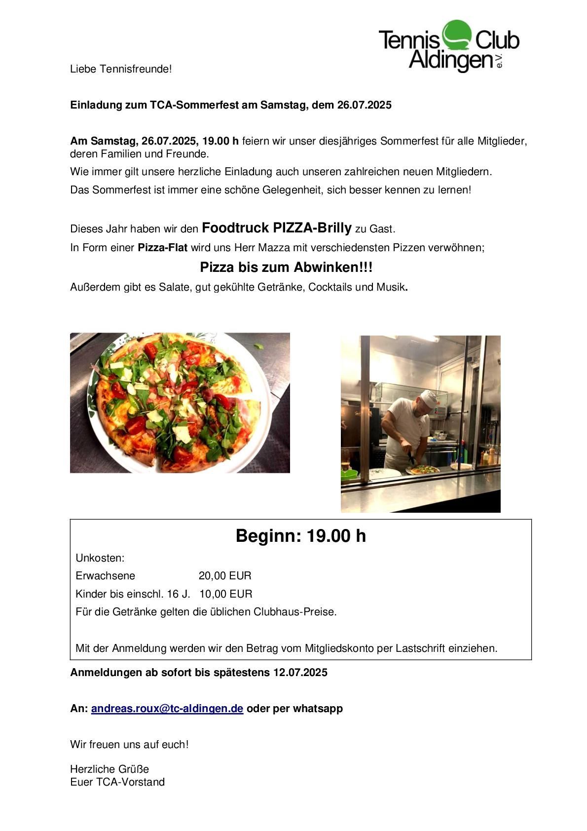 der Sommer ist jetzt definitiv da und wir freuen uns auf ein schönes Sommerfest auf der Clubanlage des TCA!