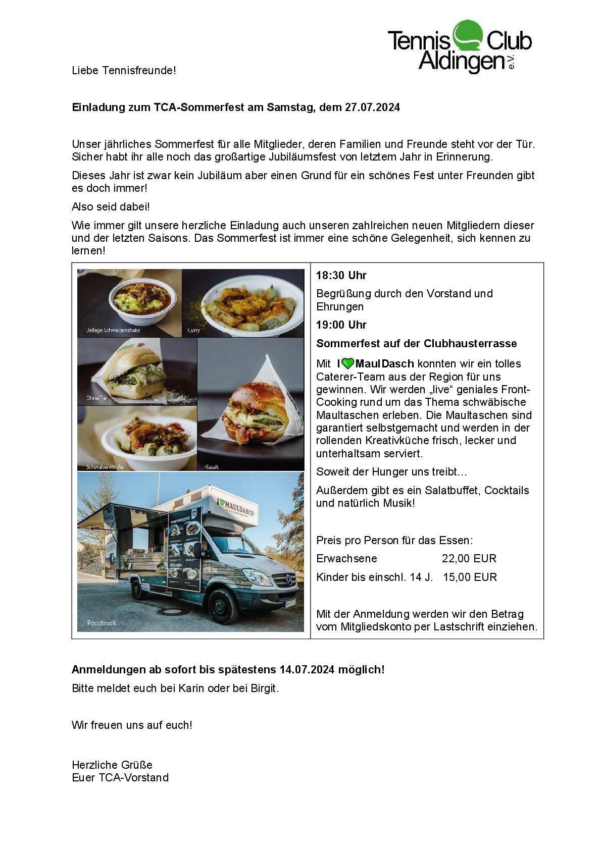 Einladung zum TCA-Sommerfest am Samstag, dem 27.07.2024