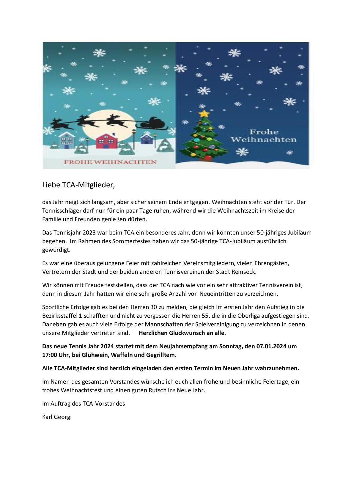 TCA-Weihnachtsbrief und Einladung zum Neujahrsempfang 2024