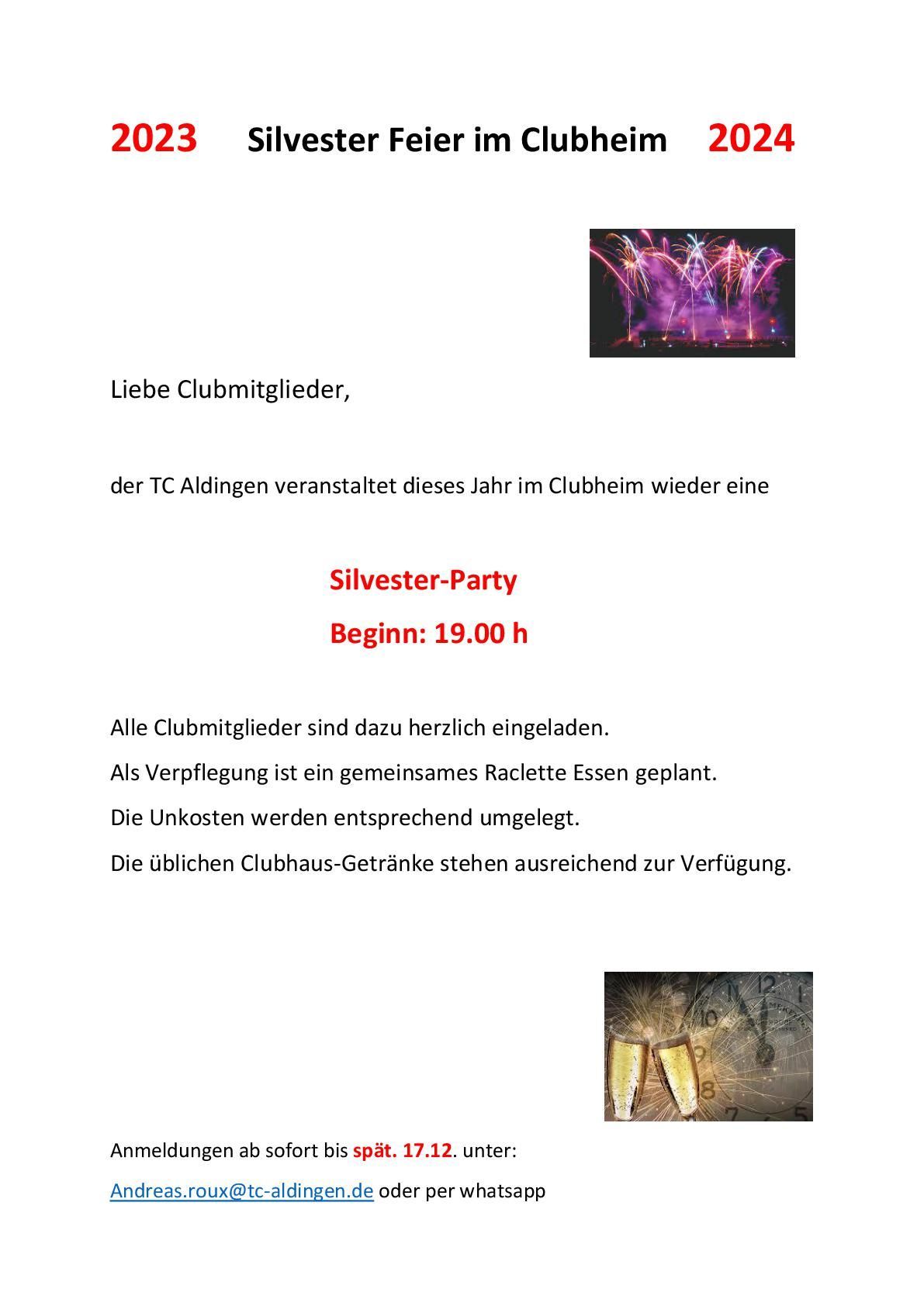 Der TC Aldingen veranstaltet dieses Jahr wieder eine Silvester Party im Clubheim.