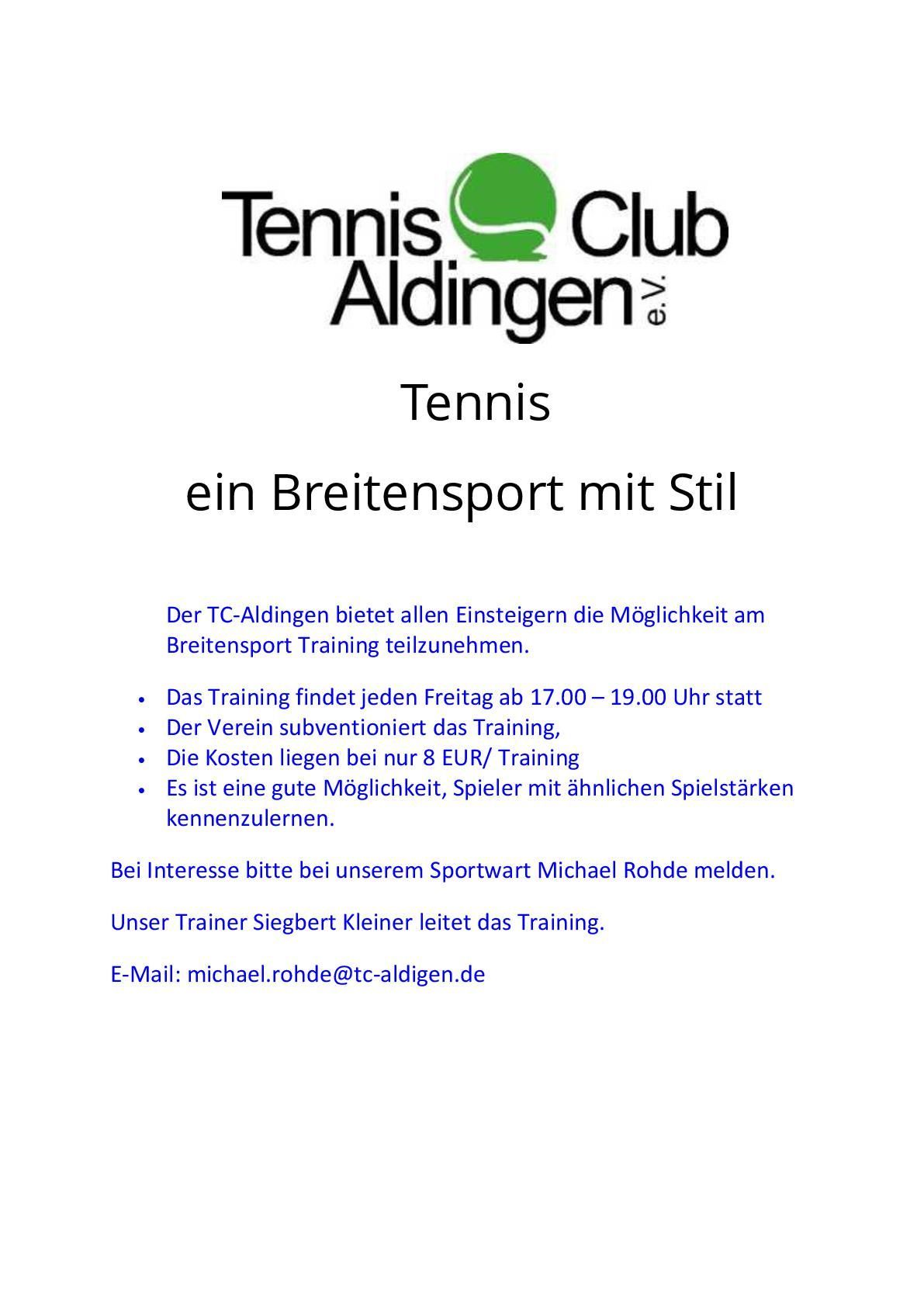 *Herren 55 - fast unschlagbar* (spg) Eine starke Saison haben die Spieler des Teams der Herren 55 in diesem Sommer hingelegt. Die weiteste Anfahrt zum Spielort hatte man beim ersten Auswärtsspiel Mitte Mai beim TC Lienzingen - am äußersten westlichen Ende des Bezirks, wo unsere Aldinger mit 7:2 einen lockeren Sieg erreichten. Das Heimspiel gegen Erdmannhausen verlief dann Anfang Juli in einer wahrhaftigen Hitzeschlacht. Die zahlreichen Zuschauer auf der Terrasse sahen dennoch hochklassige Einzel und Doppel und konnten am Ende zum 6:3 applaudieren. Die Begegnungen gegen TC Buocher Höhe (2:7) und beim TC Kirchhausen (6:3) mussten jeweils unglücklich abgegeben werden und doch hat die Mannschaft den Klassenerhalt geschafft. Besonderen Verdienst an diesem Verlauf hat Ricardo Berger, der kein einziges Match abgeben musste.  Es spielten: Siegbert Kleinert, Michael Rhode, Werner Pfisterer, Jan Müller, der unbesiegbare Ricardo Berger, Atha Tsunginidis,, Axel Morlock, Wolfgang Jäger, Andreas Schmautz
